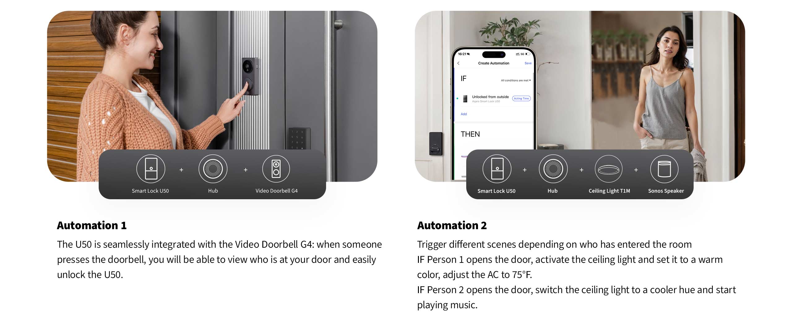 Tương thích với Apple HomeKit, Google Assistant và Amazon Alexa, khóa có thể hoạt động liền mạch với các thiết bị thông minh khác. Chẳng hạn, khi khóa cửa, hệ thống đèn sẽ tự động tắt, điều hòa chuyển về chế độ tiết kiệm – tạo trải nghiệm đồng bộ, tiện nghi và tiết kiệm năng lượng. ( Cần sự kết hợp giữa Hub + Cảm biến + Công tắc của Aqara )