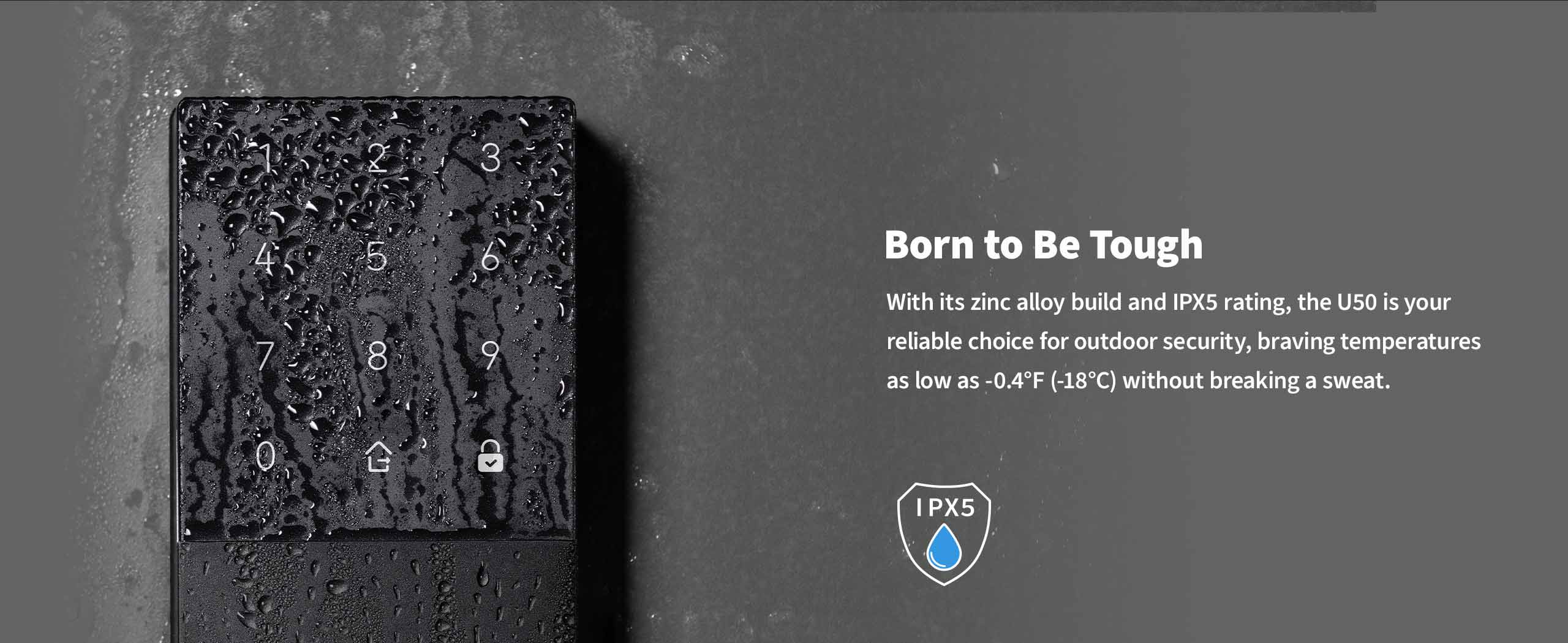 Aqara Smart Lock U50 không chỉ mang vẻ ngoài sang trọng, phù hợp với mọi kiểu nội thất, mà còn có lớp vỏ làm từ hợp kim chống ăn mòn. Khóa có khả năng chống bụi, chống nước, đảm bảo độ bền bỉ và vận hành tốt ngay cả trong điều kiện thời tiết khắc nghiệt.
