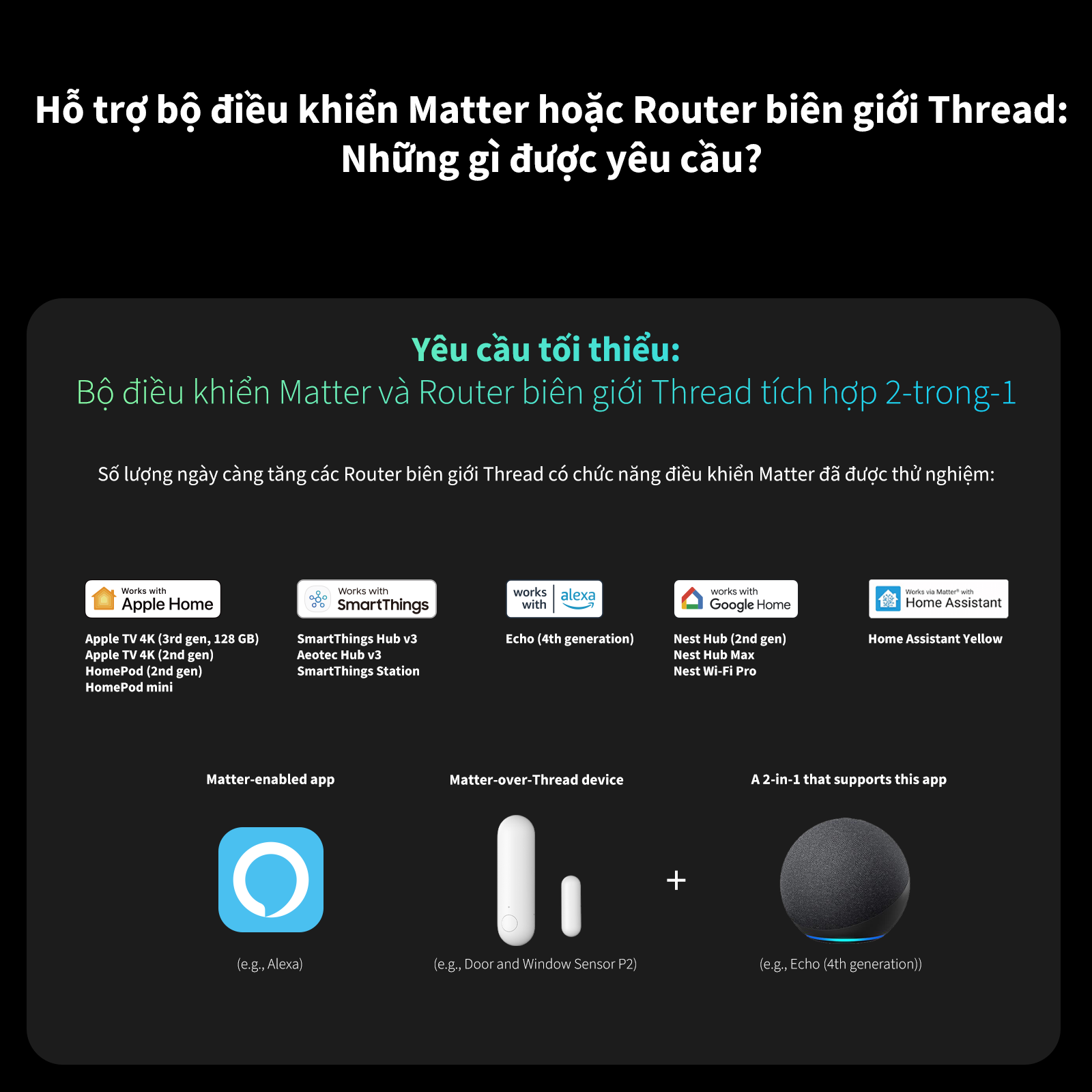 ** Lưu ý: Thiết bị cần 1 Thread Border Router (Apple TV, HomePod Mini, Nest Hub…) để sử dụng đầy đủ tính năng – chưa dùng được trên app Aqara, không tương thích với các hub Aqara hiện tại ( tiếp tục cập nhật hub M3)