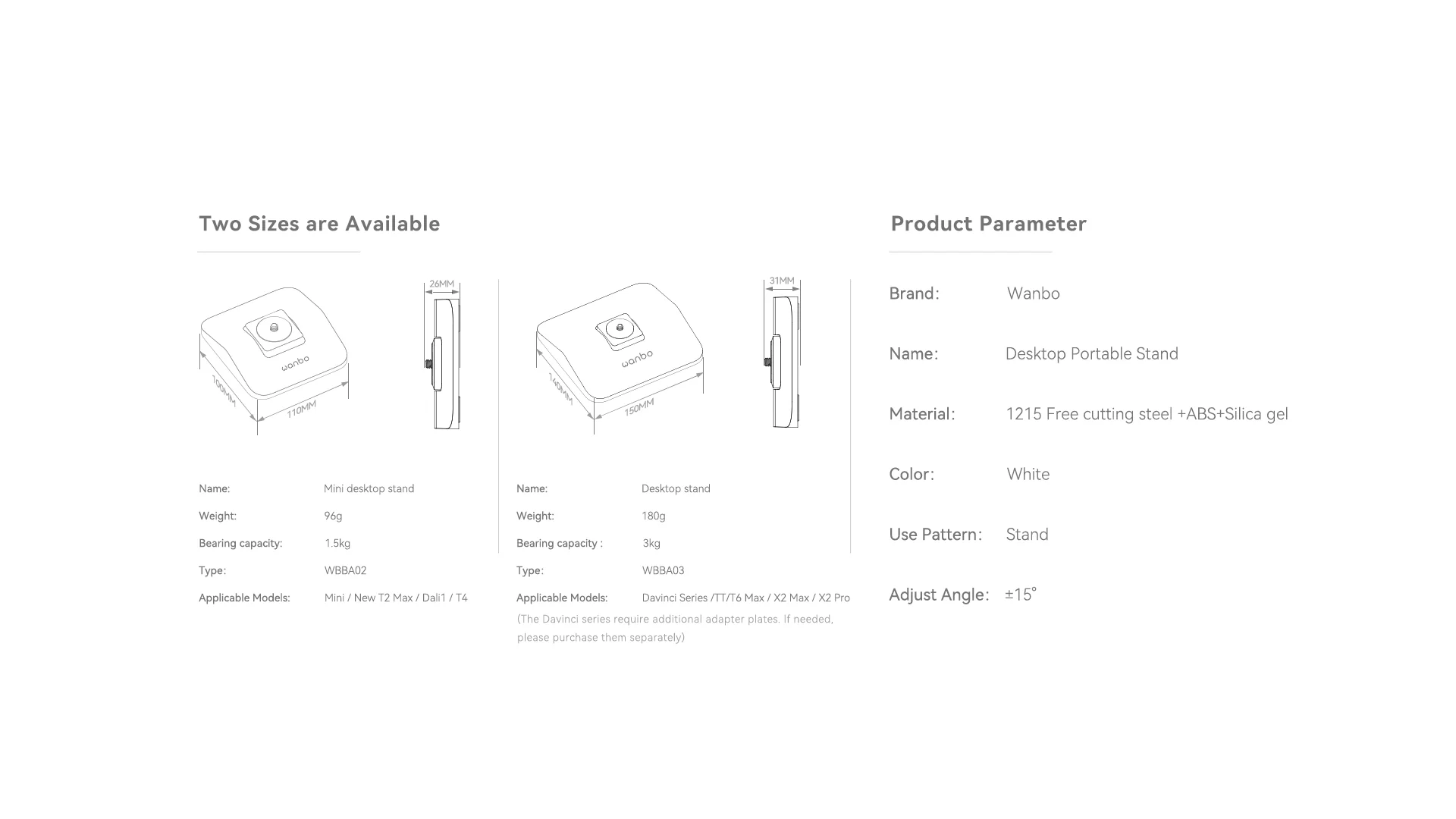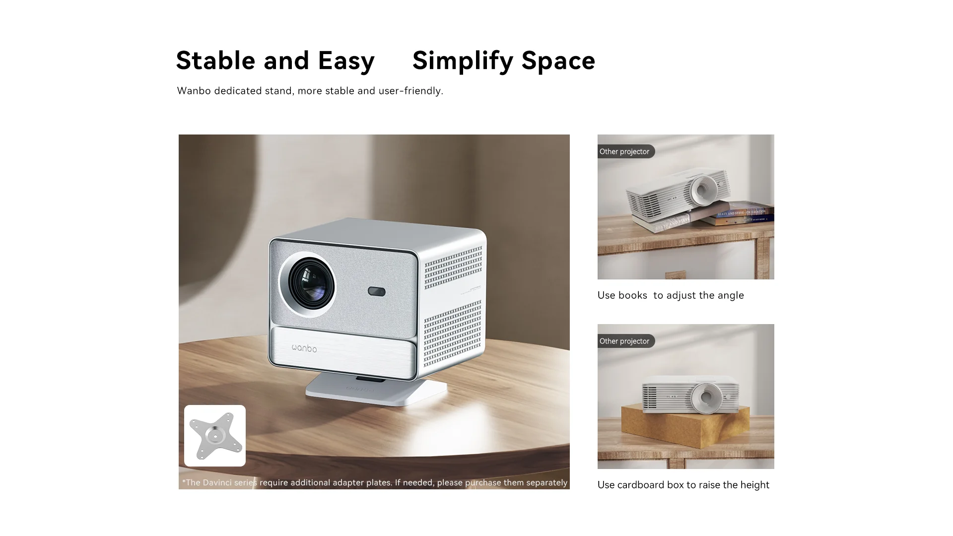 Chân đế máy chiếu để bàn Wanbo là phụ kiện hoàn hảo giúp tối ưu hóa trải nghiệm trình chiếu với thiết kế nhỏ gọn và tinh tế. Phần đầu đế có thể điều chỉnh góc nghiêng 15°, giúp người dùng dễ dàng điều chỉnh hướng chiếu phù hợp. Cơ chế tự khóa giúp cố định máy chiếu chắc chắn mà không lo bị xê dịch. Với trọng lượng nhẹ và tính di động cao, đây là lựa chọn lý tưởng cho các buổi trình chiếu tại nhà hay di chuyển.