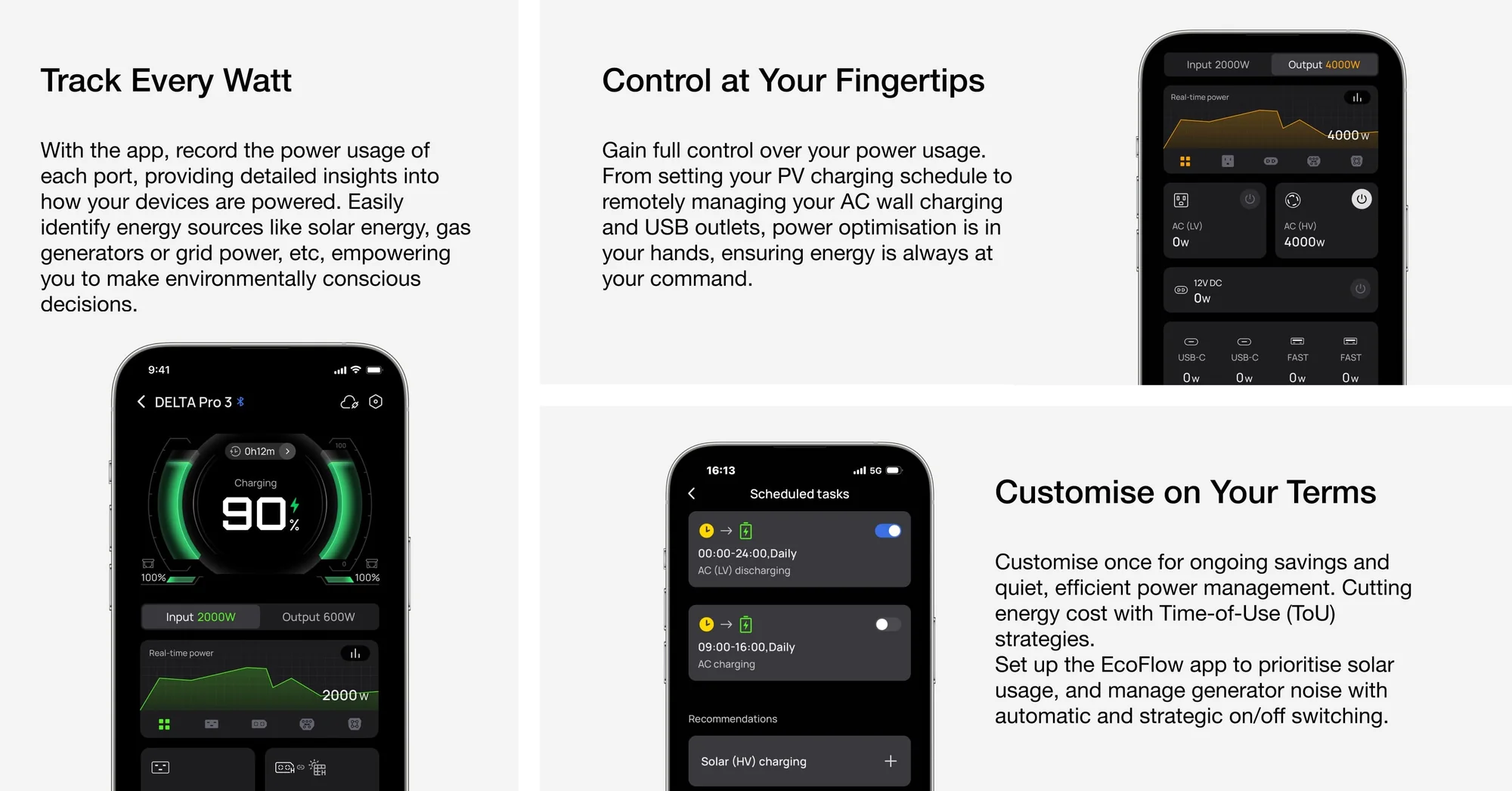 Sạc nhanh đa dạng – Sạc qua điện lưới, pin mặt trời (3000W), ô tô hoặc máy phát điện.