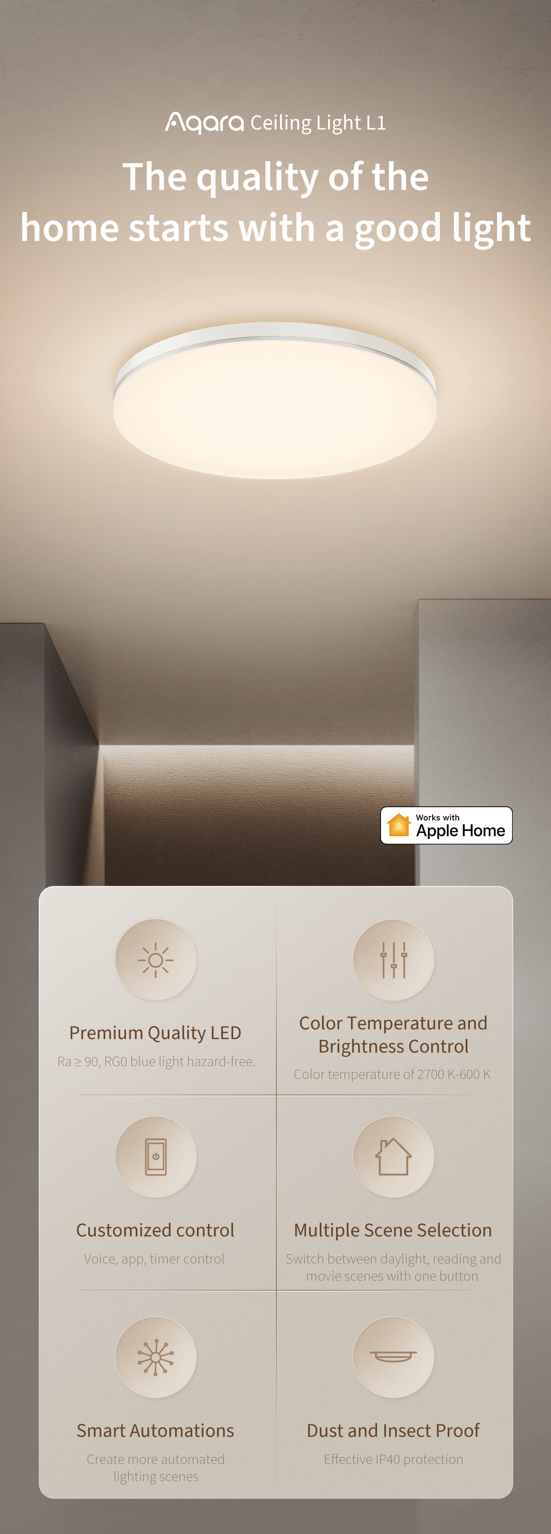 Không giống như các loại đèn ốp trần thông thường dễ bám bụi và bị côn trùng xâm nhập, đèn Aqara L1-350 đạt tiêu chuẩn IP40, giúp bảo vệ đèn khỏi bụi bẩn và hạn chế sự xâm nhập của côn trùng. Điều này giúp duy trì chất lượng ánh sáng tốt hơn, đảm bảo tuổi thọ sản phẩm lâu dài.
