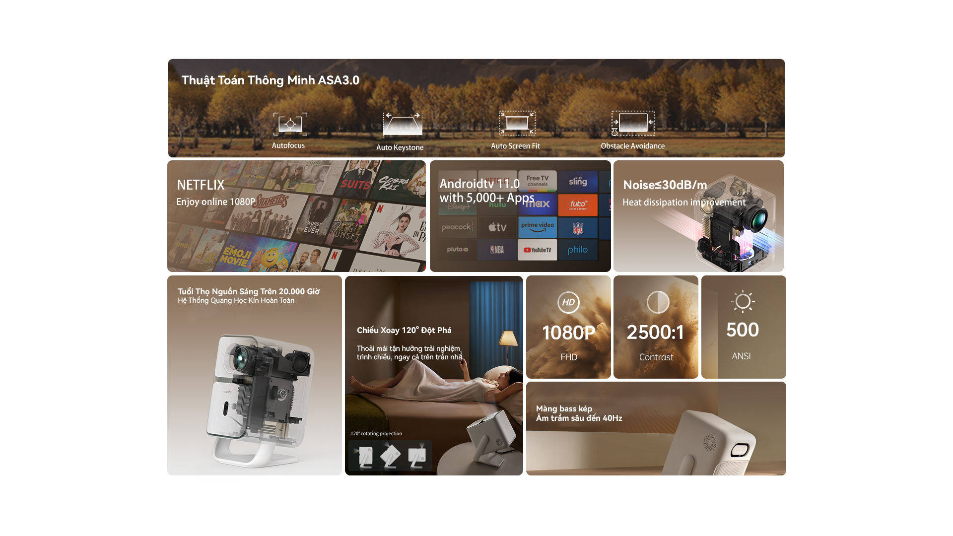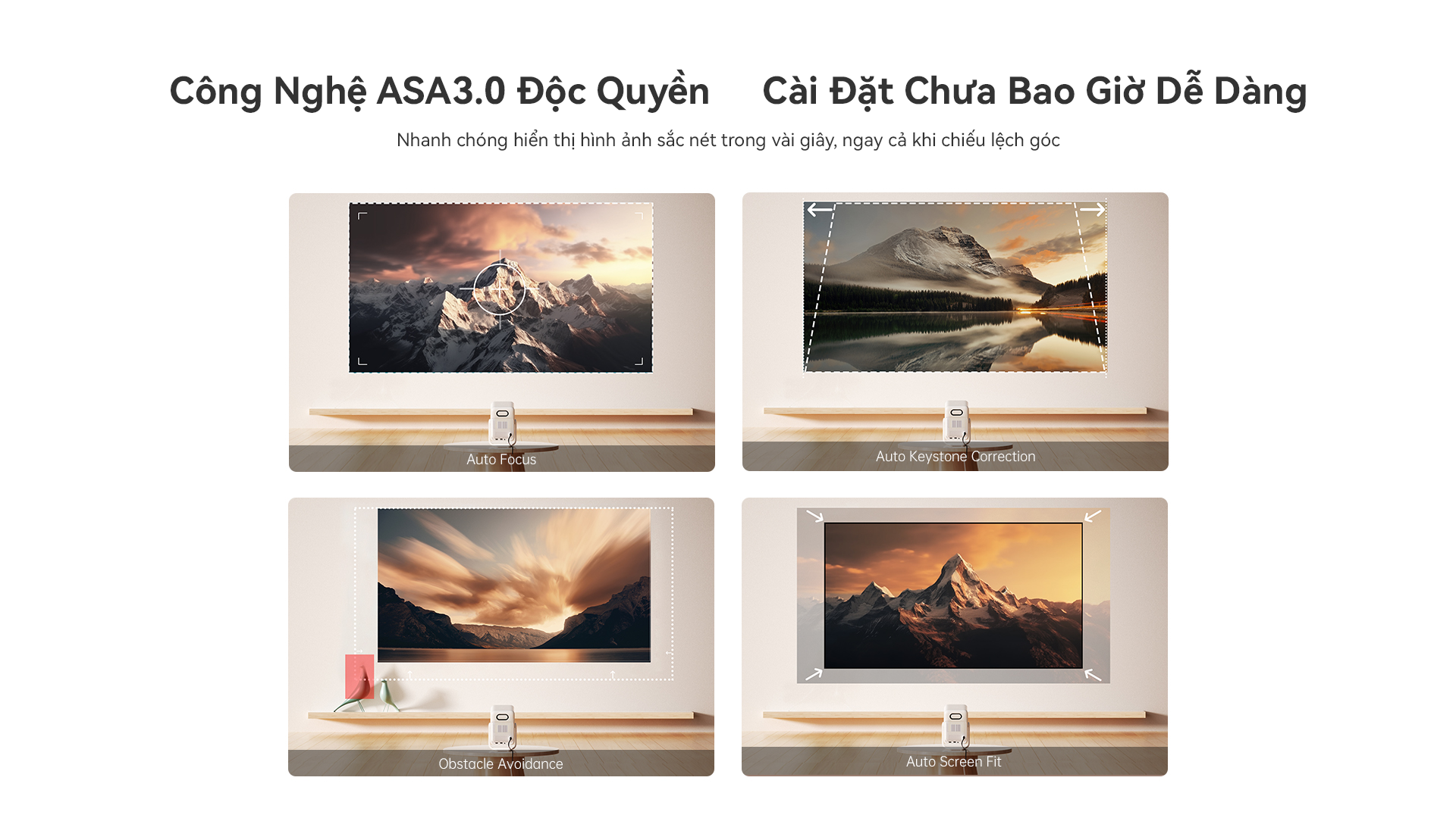 Một trong những ưu điểm vượt trội của máy chiếu có chân đế đầu tiên này chính là công nghệ tự động căn chỉnh hình ảnh ASA 3.0, giúp khung hình luôn chuẩn xác, ngay cả khi đặt máy ở góc nghiêng. Tính năng lấy nét tự động giúp hình ảnh luôn sắc nét mà không cần điều chỉnh thủ công.