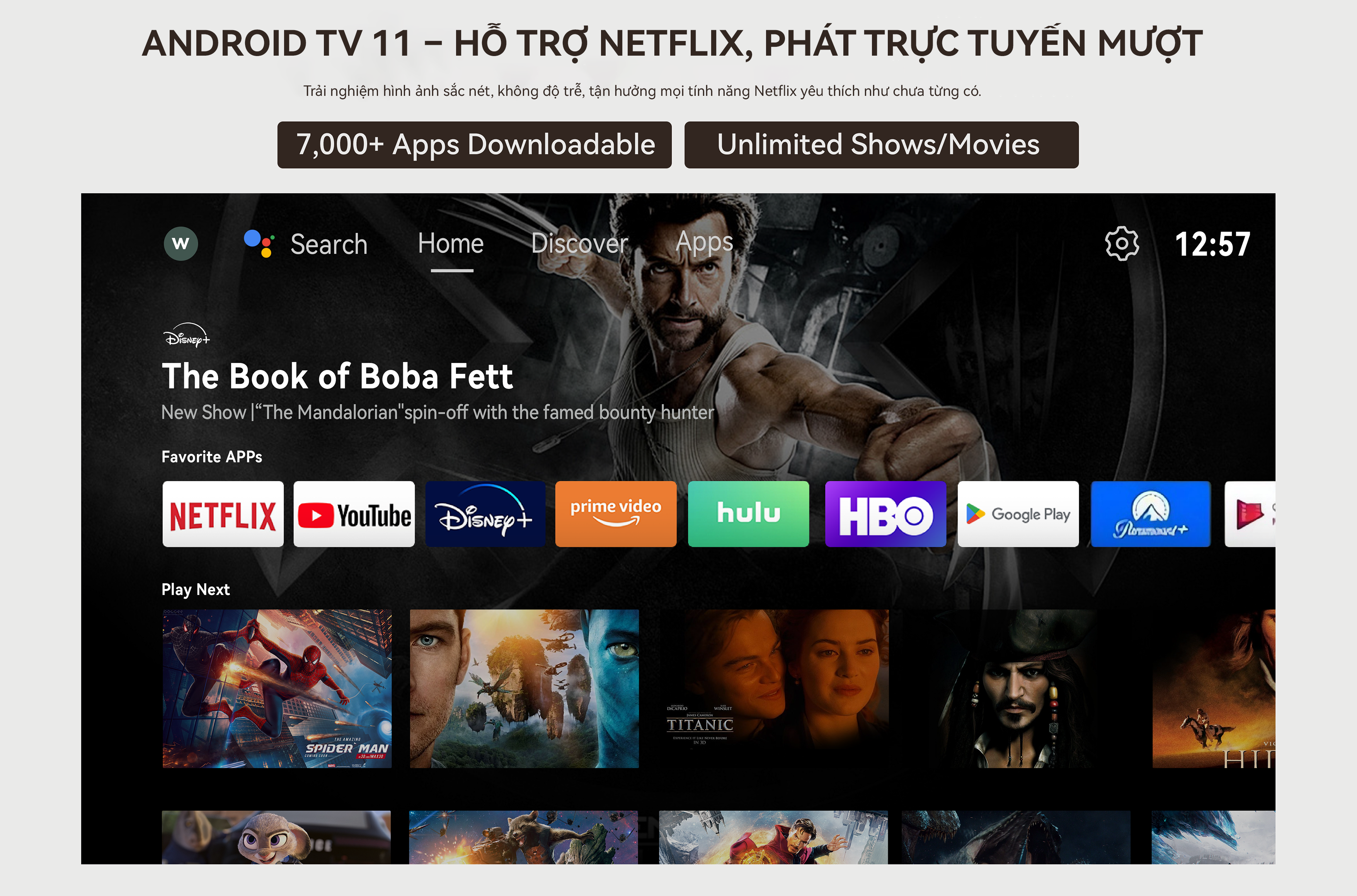 Được tích hợp hệ điều hành Android TV 11, Vali 1 mở ra thế giới giải trí vô tận với hơn 7.000 ứng dụng có sẵn trên Google Play. Bạn có thể truy cập trực tiếp vào các dịch vụ phát trực tuyến như Netflix, YouTube, HBO Max và nhiều hơn nữa. Tính năng Chromecast tích hợp cho phép bạn truyền nội dung không dây từ điện thoại, máy tính bảng hoặc laptop lên màn hình lớn một cách dễ dàng và nhanh chóng.
