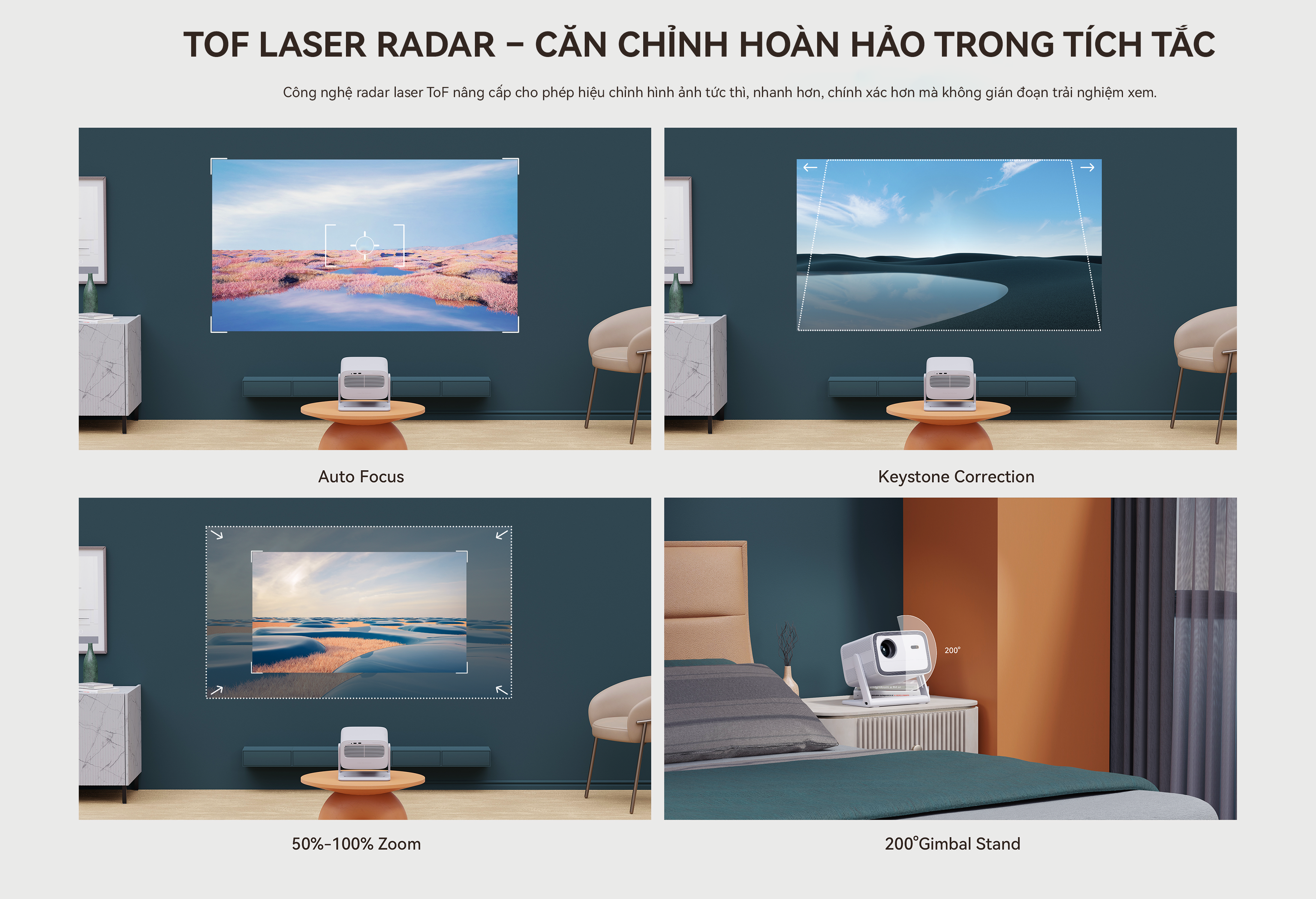 Góc chiếu Gimbal 200°: Hệ thống gimbal linh hoạt 200° cho phép đặt máy chiếu ở nhiều vị trí khác nhau.