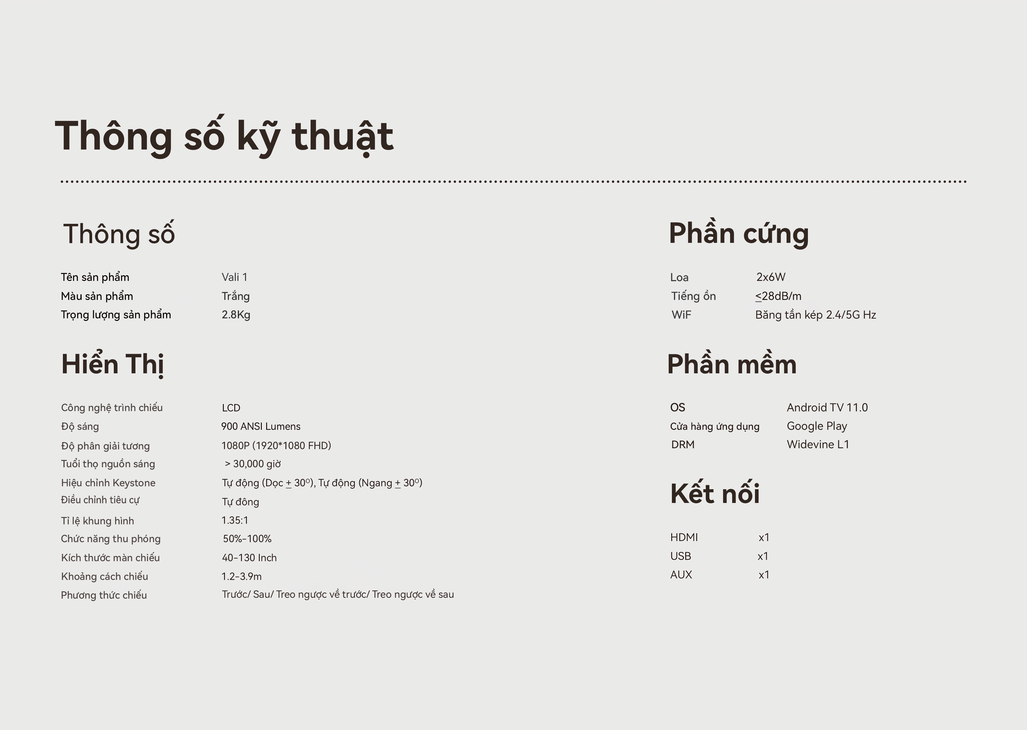 Với độ sáng 900 ANSI lumens và độ phân giải Full HD 1080P, Vali 1 đảm bảo hình ảnh hiển thị rõ nét và sống động ngay cả trong môi trường có ánh sáng mạnh. Dù bạn xem phim, chơi game hay thuyết trình, máy chiếu này đều mang đến chất lượng hình ảnh tuyệt vời, giúp nội dung trở nên chân thực và hấp dẫn hơn.
