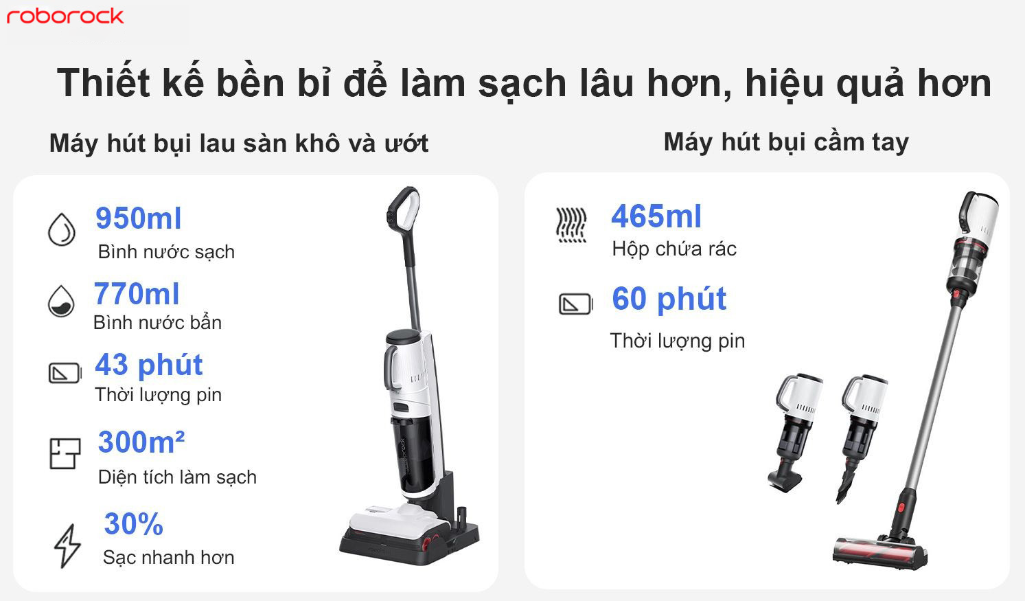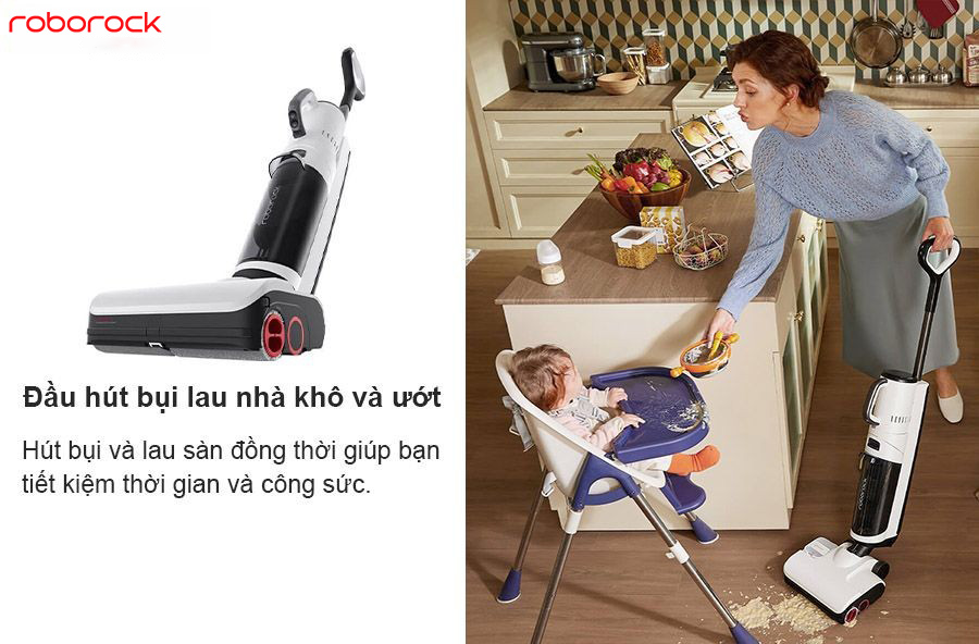 - Tính năng cảnh báo bằng giọng nói giúp người dùng nắm bắt thông tin dễ dànViên pin với hiệu suất cao hơn 30% so với dòng Roborock Dyad, hộp chứa rác, bình nước sạch và nước bẩn dung tích lớn