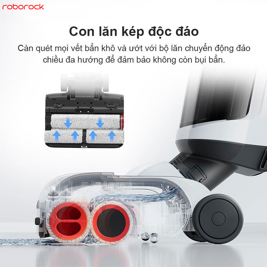 Roborock Dyad Pro Combo được nhà sản xuất trang bị hệ thống DyadPower với 2 con lăn phía trước và một con lăn phía sau xoay ngược chiều nhau. Nhờ có cơ chế hoạt động như vậy mà mọi loại chất bẩn, bụi, rác đều được hút vào bên trong ngăn chứa nước bẩn của máy dễ dàng.