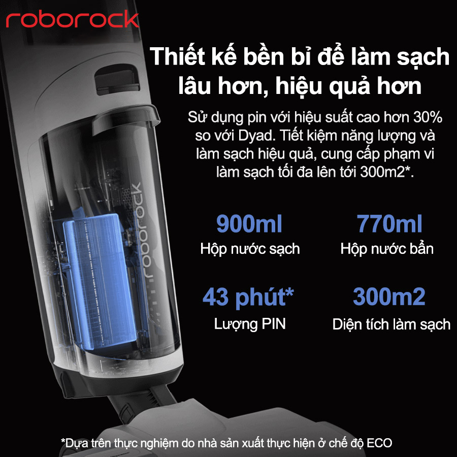 Máy hút bụi lau nhà ướt và khô cầm tay Dyad Pro được thiết kế thông minh khi trang bị 2 khoang chứa nước sạch và bẩn riêng biệt với dung tích lớn. Với khoang chứa nước bẩn có dung tích 770ml và khoang chứa nước sạch có dung tích lên đến 900ml và còn có khoang riêng để bỏ dung dịch tẩy rửa. Qua đó máy có thể dọn dẹp trong không gian lớn lên đến 300m2 chỉ với 1 lần sạc