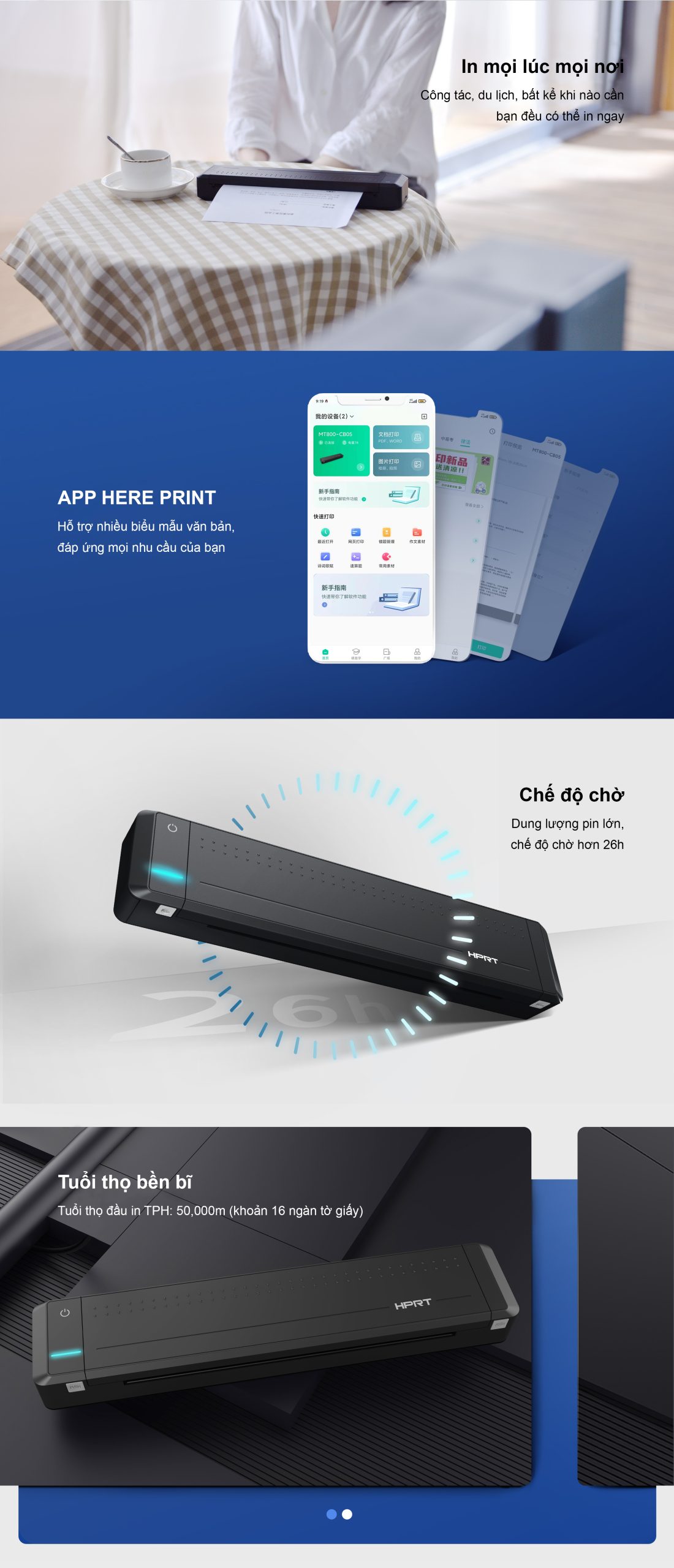 Máy in được trang bị pin dung lượng lớn 2000mAh, cho phép in ấn liên tục và có thời gian chờ lên đến 26 giờ. Điều này đảm bảo máy luôn sẵn sàng hoạt động mà không lo hết pin giữa chừng.