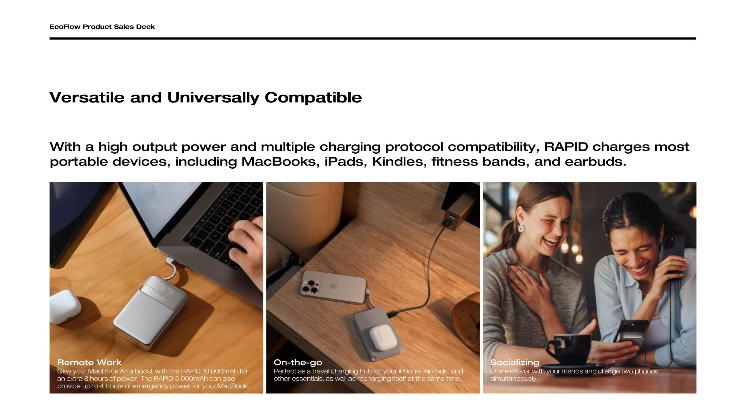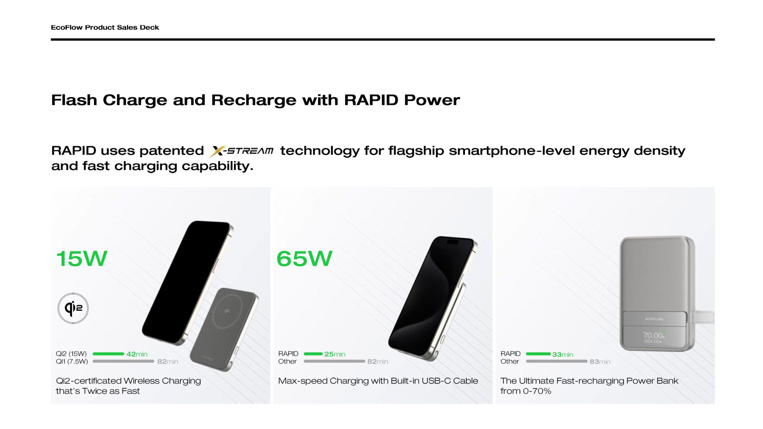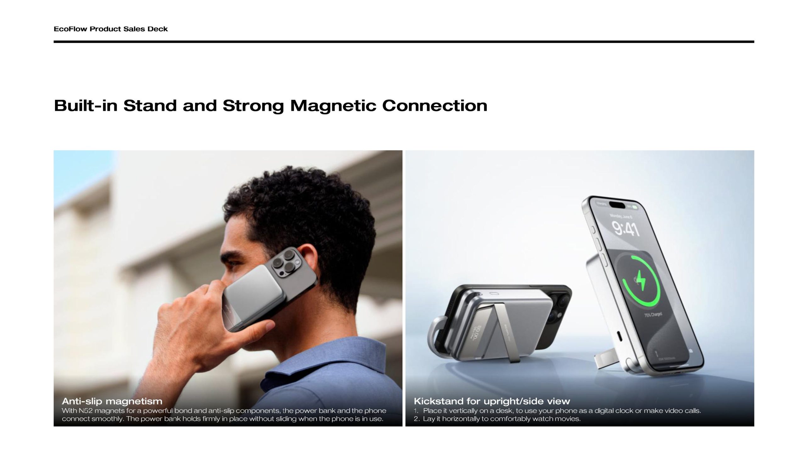 EcoFlow thiết kế Rapid Magnetic đặc biệt tối ưu cho người dùng iPhone, đặc biệt từ dòng iPhone 12 trở lên với tính năng MagSafe. Không cần dây, không cần gắn thêm phụ kiện – chỉ cần “hít” là sạc. Đây chính là trải nghiệm sạc mà người dùng hiện đại mong đợi ở một pin dự phòng sạc không dây chất lượng.