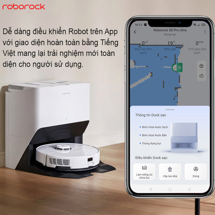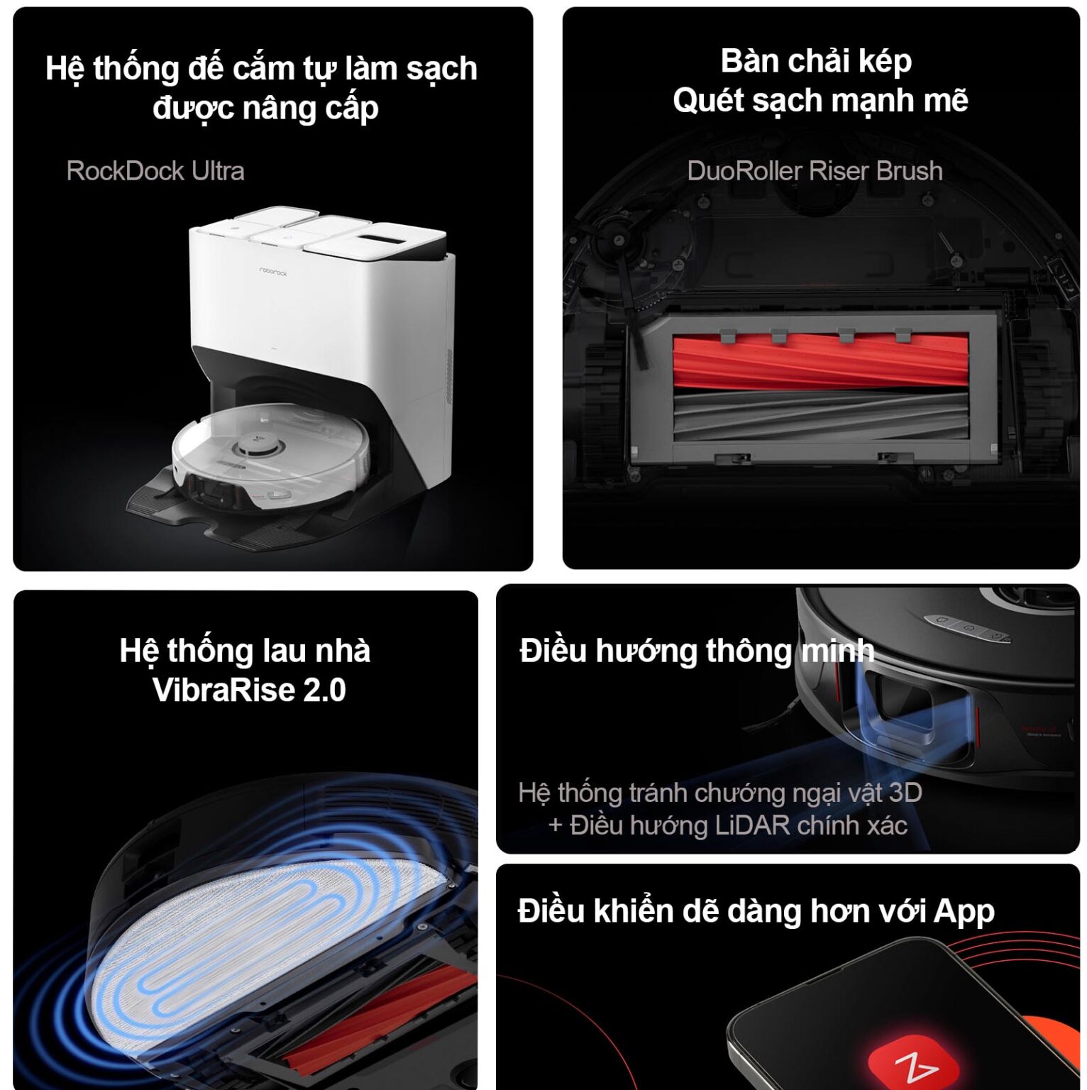 - RockDock Ultra Strong 1 tự hút rác, tự sấy, tự vệ sinh, tự bơm nước, tự giặt giả và tự động sạc nhanh hơn 30%