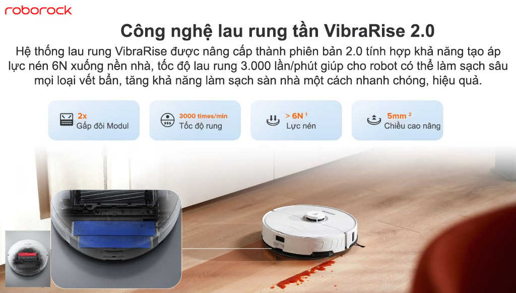 - Hệ thống lau VibraRise 2.0 cải thiện độ rung cho áp lực lớn hơn giúp robot có thể làm sạch mọi thứ