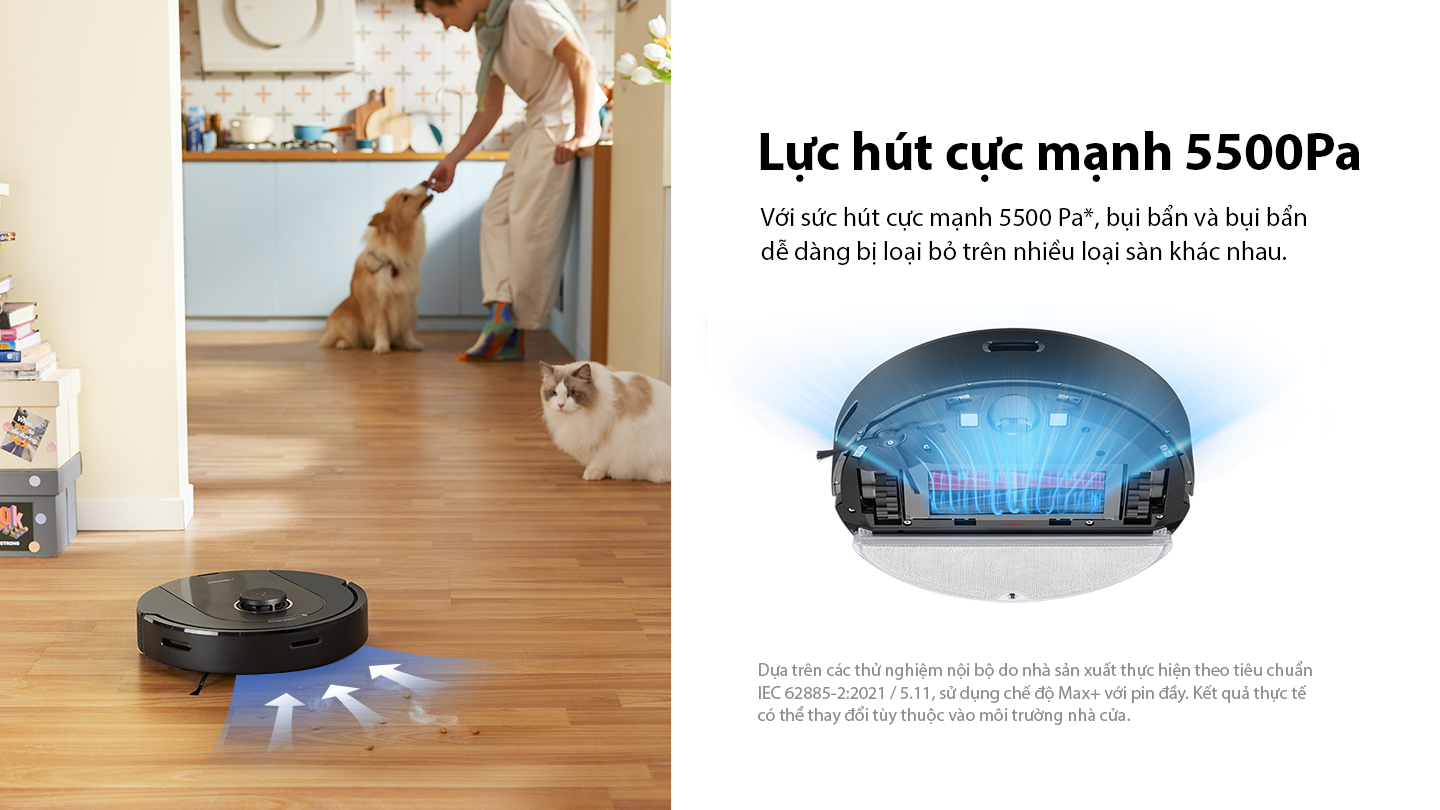 Với sức hút cực mạnh 5500Pa, mẫu robot này sẽ dễ dàng loại bỏ bụi bẩn trên mọi loại sàn và làm sạch sâu trên thảm, cải thiện khả năng thu lông và giảm rối tóc. Lựa chọn tuyệt vời cho gia đình có thú cưng.