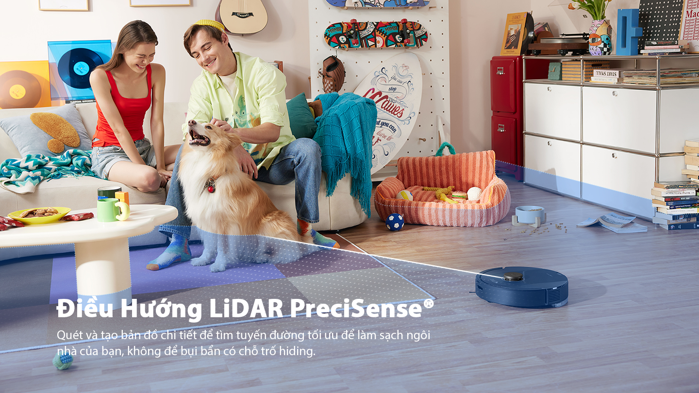 Hệ thống định vị LiDAR PreciSense với bản đồ 3D giúp Q5 Pro di chuyển chính xác trong ngôi nhà của bạn, tạo ra bản đồ chi tiết và tìm tuyến đường tối ưu để làm sạch.